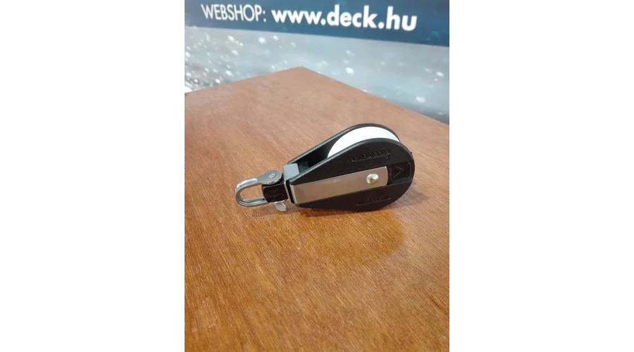Fekete műanyagból készült, rozsdamentes acél merevítőkkel szerelt egy csapágyas csiga.